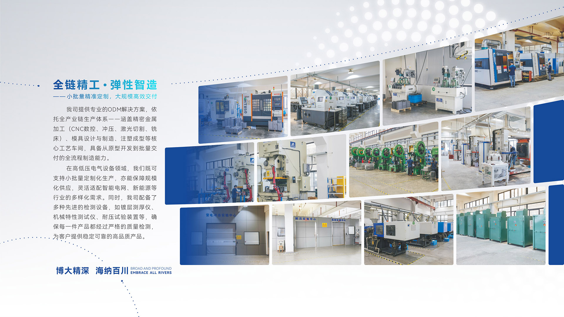 公司经过多年的专业研究和积累,在产品设计技术、制造技术、质控技术、营销技术等方面具有独特优势,拥有一支出色的研发、工艺、检试技术团队和一支可靠的管理经营团队;公司配有注塑、车铣、激光、折弯、冲压、焊接、APG工艺注射等众多精良加工设备及局放试验、工频耐压试验、雷电冲击、盐雾试验、机械特性等齐全的精密测量、试验仪器设施。